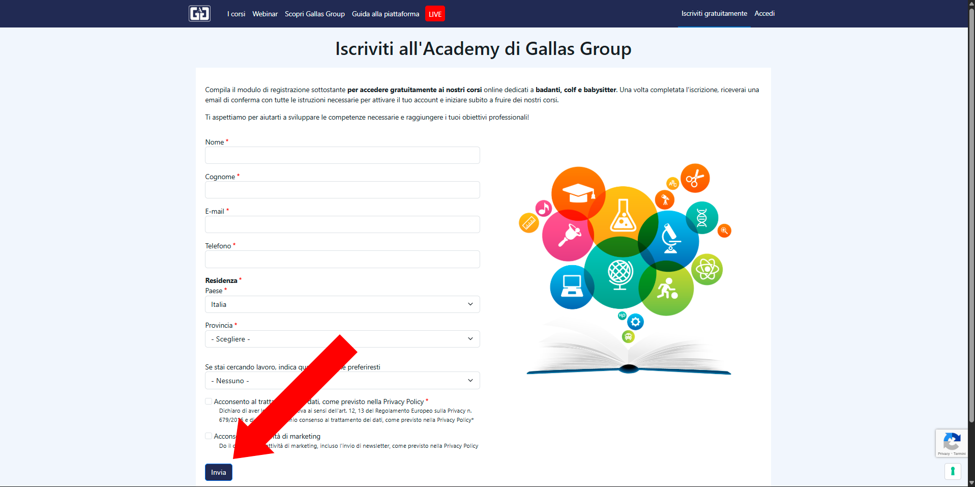 Compila il modulo di registrazione inserendo tutti i dati richiesti, e premi su "invia".