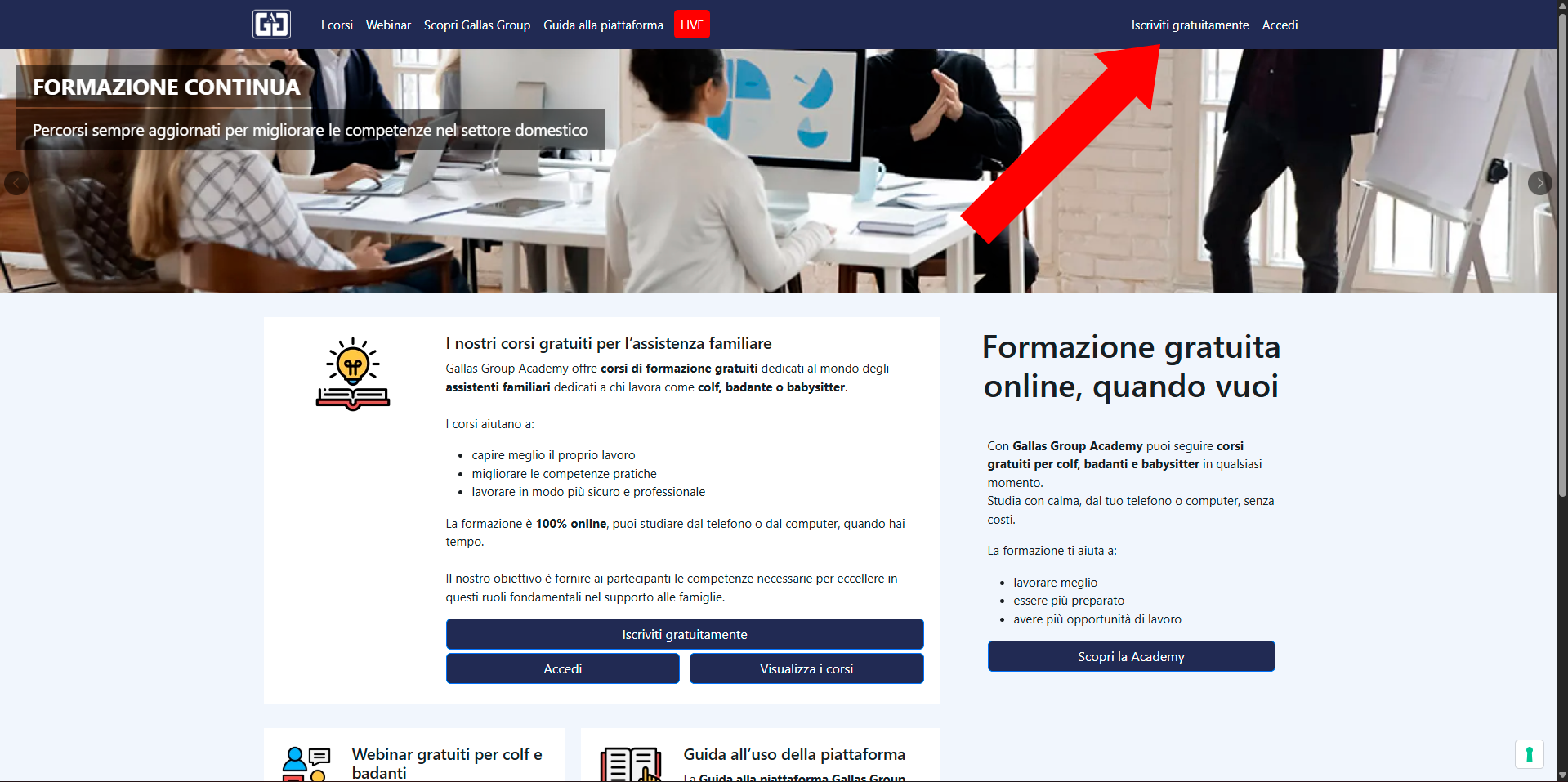 Per iniziare il tuo percorso formativo, collegati alla homepage della piattaforma e clicca sul pulsante "Iscriviti gratuitamente" che trovi in alto a destra: